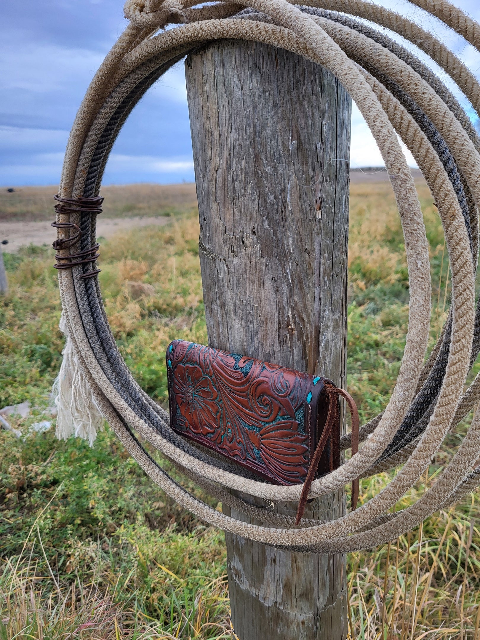 Ladies wallet with handcarved floral detail exterior. Turquoise buckstitch and rose gold snap closure. Five interior card slots. Space to hold a 3 x 6 inch cell phone.